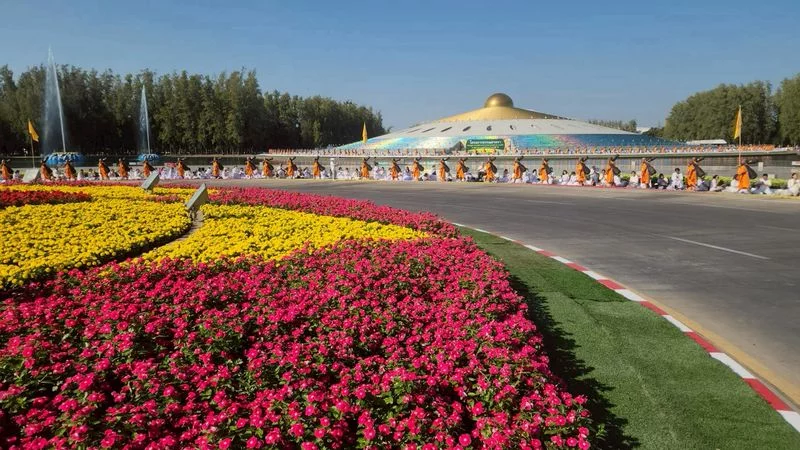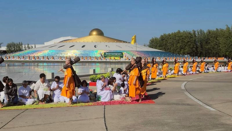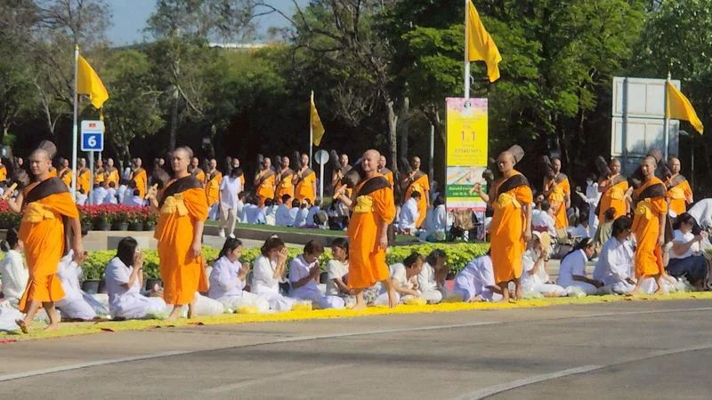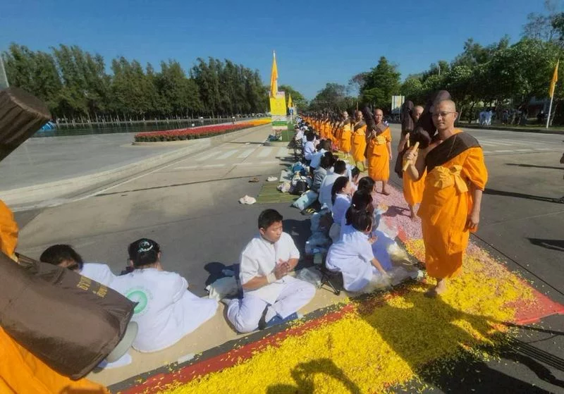 On 2 December 2026, at 3.00 pm, Luang Por Dhattajivo as monastic chairman, together with Venerable Phrakhrupaladrattanaveerawat, abbot of Wat Pha Dhammakaya, led the procession of 1,142 monks under the Dhammayatra project in honor of the Great Master Phramongkolthepmuni (Sodh Cantasaro).  The monks’ procession left from the eastern gate of the Memorial Hall of Phramongkolthepmuni, turned right at DMC Building, turned right again at International Buddhist Society’s junction, passed the front of the Memorial Hall of Phramongkolthepmuni, headed to Sen-Thang-Dhammachai Road and turned right at a junction for the destination at Maha Dhammakaya Cetiya. Along the total 6.95 kilometers of procession route, the laypeople including teachers, V-Star students and foreigners welcomed the pilgrim monks by spreading the flower petals along the path of Dhammayatra monks as the merit making for the auspicious New Year 2026.