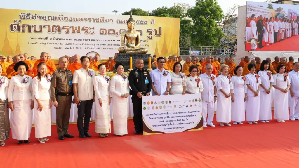 On 8 March 2026, at Thao Suranari (Ya Mo) Monument, Nokhon Ratchasima province, Most Venerable Phrapromsitthi, committee member of Sangha Supreme Council of Thailand, ecclesiastical chief of Region 11 and abbot of Wat Saket Ratchaworamahawihan, presided over the almsgiving to 10,000 monks and Vice Governor of Nokhon Ratchasima province Vijit Kijvirat was the laypeople chairman. This alms offering was organized for the purpose of celebrating the 558th foundation anniversary of Nokhon Ratchasima province and dedicate merit to the former Thai kings and ancestors, including the King Rama IX and the Queen Mother Sirikit.